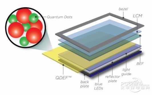 通俗點(diǎn)說,目前的量子點(diǎn)顯示器就是在VA面板中加了一張膜,也就是上圖中的那張QDEF膜。